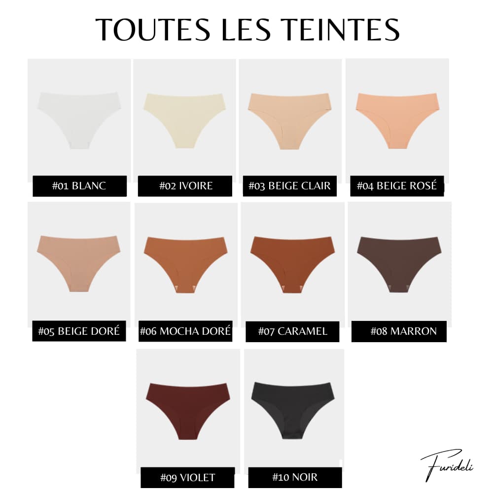 Pour plus de discrétion, notre culotte invisible est disponible en 10 teintes pour être portée sous n'importe quel vêtement.
