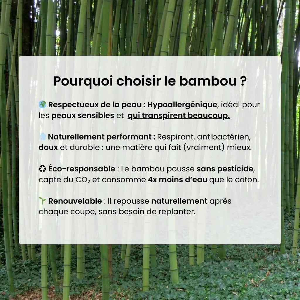 Le bambou est une matière naturelle qui allie confort, performance et durabilité. Il évacue mieux la transpiration que le coton, reste frais même sous pression, et respecte les peaux sensibles.